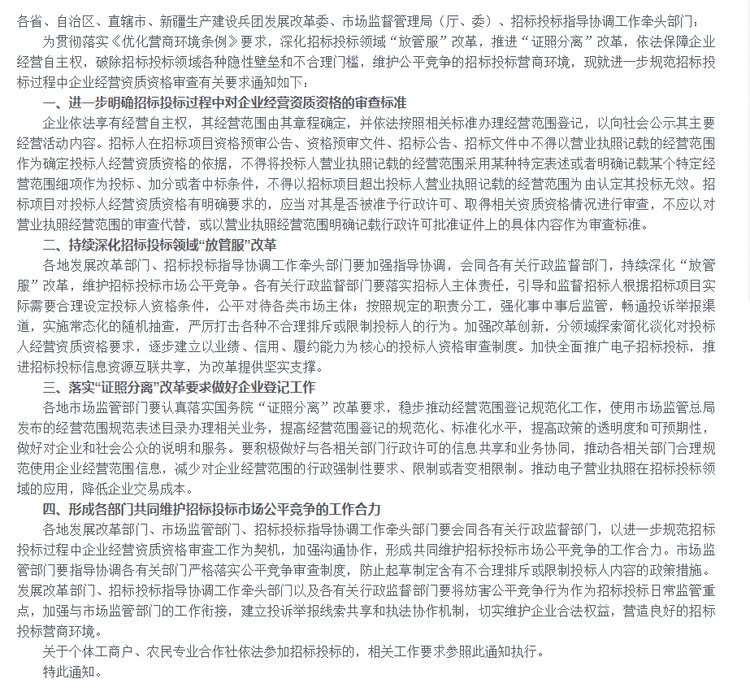 以前招標(biāo)方以營業(yè)執(zhí)照記載的經(jīng)營范圍為理由排斥其他投標(biāo)人,可能還屬于打了擦邊球,被排斥的投標(biāo)人有口也說不出啥。而此次發(fā)改委的政策通知一出,就相當(dāng)于官宣了,以后招標(biāo)方就不能再這樣操作了?。?!